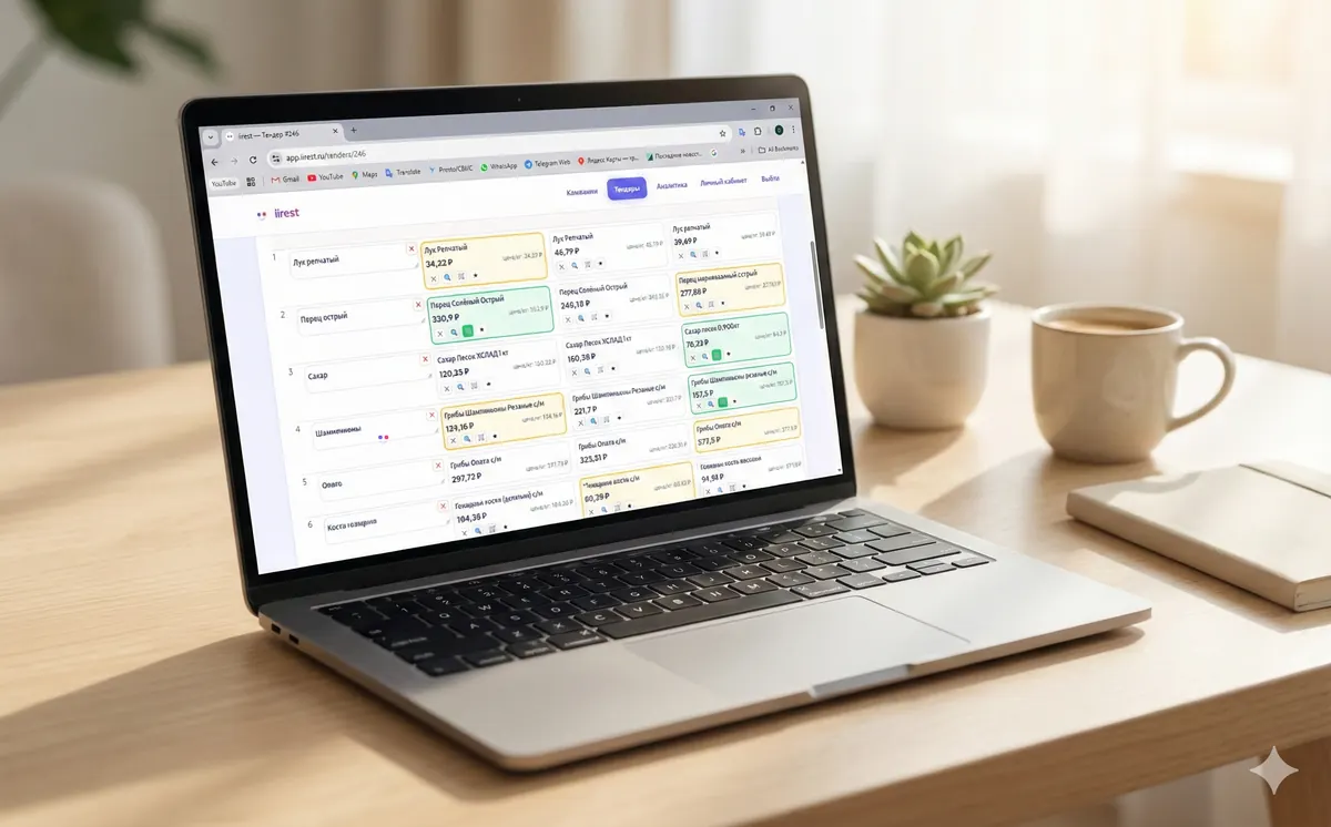 iiRest помогает быстро собрать закупку по нескольким поставщикам и увидеть лучший сценарий по конкретному списку товаров.